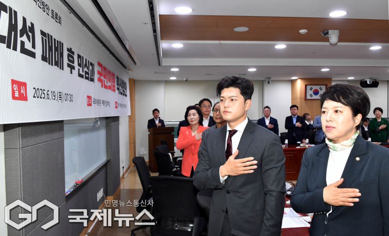 (서울=국제뉴스) 19일 서울 여의도 국회 의원회관에서 열린 '대선 패배 후 민심과 국민의힘 혁신방안' 토론회에서 김용태 비상대책위원장 등 참석자들이 국민의례를 하고 있다./사잔=이용우 기자