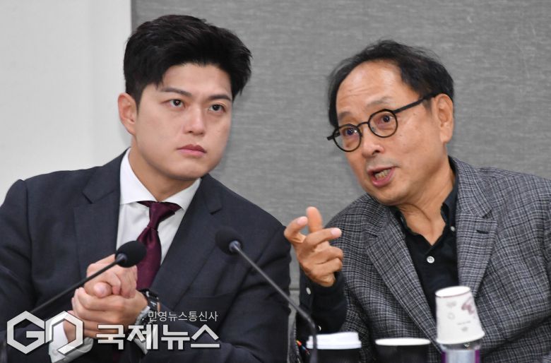 (서울=국제뉴스) 19일 서울 여의도 국회 의원회관에서 열린 '대선 패배 후 민심과 국민의힘 혁신방안' 토론회에서 김용태 비상대책위원장과 김형준 배재대 석좌교수가 대화하고 있다./사진=이용우 기자