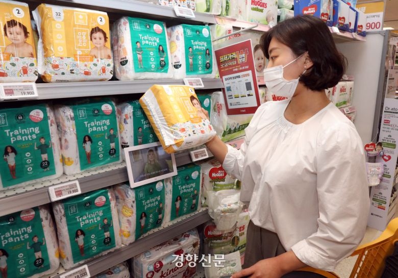한 여성이 성수 이마트의 기저귀 코너에 진열된 기저귀를 살펴보는 모습. 기사내용과 관련없음. 경향DB |