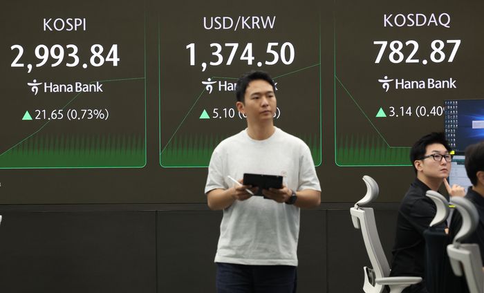 코스피가 상승 출발한 19일 오전 서울 중구 하나은행 본점 딜링룸 전광판에 코스피 지수가 표시되고 있다. [사진=뉴스1] |