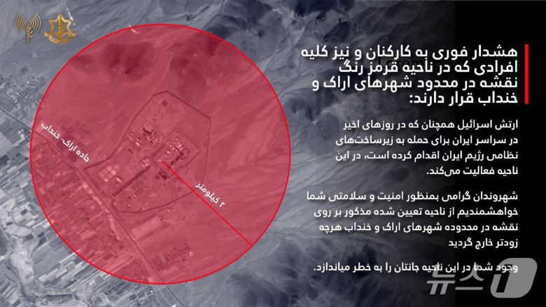 이스라엘군은 이날 사회관계망서비스 엑스(X)를 통해 이란의 아라크 중수로 인근 지역 주민들에 대한 대피 경고문을 페르시아어와 아랍어로 게시했다.
