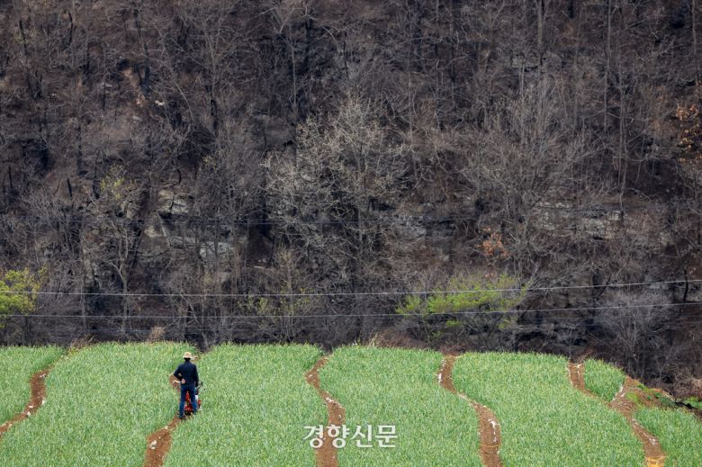경북 의성군 단촌면의 한 밭에서 농민이 지난 4월20일 불에탄 산을 바라보고 있다. 이준헌 기자 |