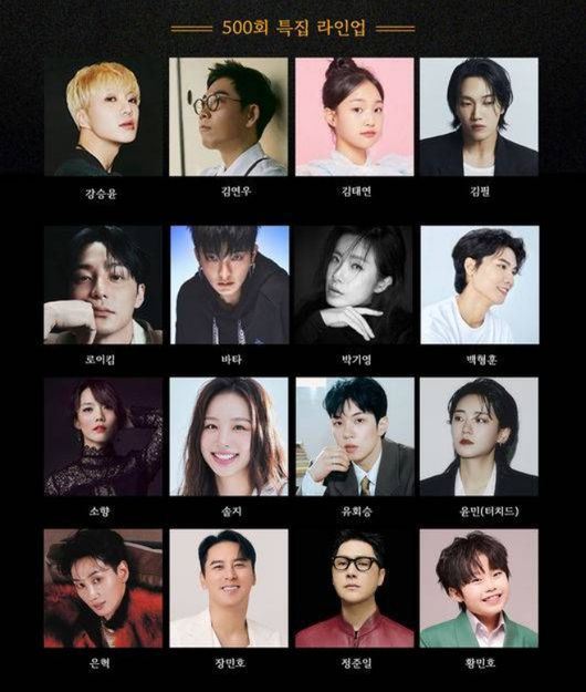 장수 예능이 흔하지 않은 만큼 이를 기리는 특집 또한 드문 일이다. 실제 '복면가왕'의 10주년 500회 특집은 제대로 '특집'다웠다. 파일럿 시절부터 포문을 연 '초대 가왕' EXID(이엑스아이디) 솔지부터 '복면가왕' 초창기 신드롬을 견인한 가왕 클레오파트라 김연우를 비롯해 최다연승인 9연승을 기록한 터치드의 윤민과 가수 정준일은 물론 아이돌 출신의 선입견을 깬 가왕 위너의 강승윤과 엔플라잉의 유회승이 참석했다. 여기에 가수 김태연, 김필, 로이킴, 박기영, 백형훈, 소향, 슈퍼주니어 은혁, 장민호, 황민호, 댄서 바타 등이 참석해 축제 같은 무대를 장식했다.
