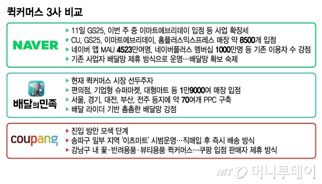 배달의민족(이하 배민)이 독주하는 퀵커머스 시장에 네이버(NAVER)가 도전장을 냈다. 국내 이커머스 시장에서 쿠팡과 자웅을 겨루고 있는 네이버가 퀵커머스 시장을 선점하려는 의도로 보인다. 쿠팡도 이 시장 공략을 타진하고 있어 세 기업이 벌일 진검승부에 업계가 주목하고 있다.