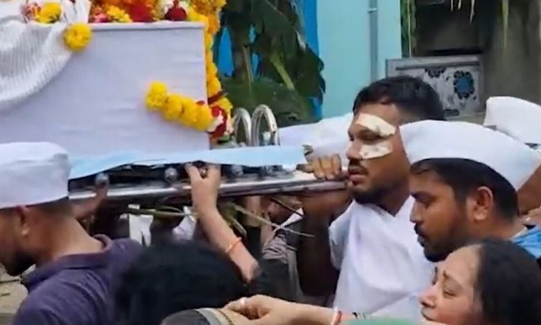 에어 인디아 추락 사고의 유일한 생존자 비스와시 쿠마르 라메쉬가 지난 17일 퇴원해 얼굴에 붕대를 붙인 채로 형의 장례식에서 관을 운구하며 슬퍼하고 있다. 출처 더 선 |