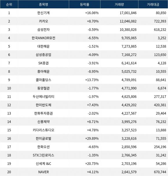 한편, 거래량 상위 20위권 종목들은 두산에너빌리티(034020) ▼-1.97%, 한미반도체(042700) ▲7.43%, 한화투자증권(003530) ▼-2.02%, 신풍제약(019170) ▲8.71%, 키다리스튜디오(020120) ▲4.78%, 한미글로벌(053690) ▲29.89%, 한화오션(042660) ▼-4.65%, STX그린로지스(465770) ▼-1.35%, 신세계 I&C(035510) ▲20.75%, NAVER(035420) ▲4.11% 등의 성적을 기록했다.