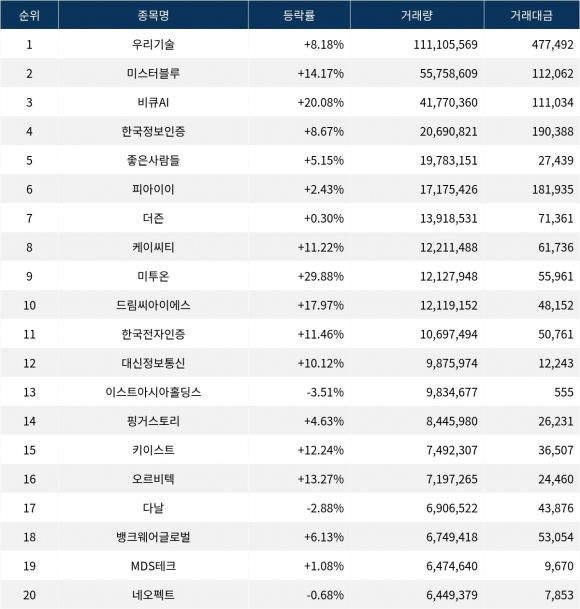 한편 거래량 상위 20위권 종목들은 한국전자인증(041460) ▲11.46%, 대신정보통신(020180) ▲10.12%, 이스트아시아홀딩스(900110) ▼3.51%, 핑거스토리(417180) ▲4.63%, 키이스트(054780) ▲12.24%, 오르비텍(046120) ▲13.27%, 다날(064260) ▼2.88%, 뱅크웨어글로벌(199480) ▲6.13%, MDS테크(086960) ▲1.08%, 네오펙트(290660) ▼0.68% 등의 성적을 기록하고 있다.