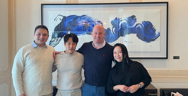 (왼쪽부터)카므란 수입 총괄책임자, 정진우 비투에스컴퍼니 대표, 크리스토퍼 TBL 스위비 대표, 수잔 리 스위비 아시아 브랜딩 총괄책임자가 기념사진을 촬영하고 있다./제공=비투에스컴퍼니 |