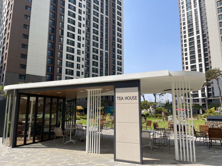 입주민들이 여유롭게 머물 수 있도록 마련된 티하우스는 쉼과 만남의 공간 역할을 한다. 차분한 디자인의 파빌리온 안쪽에는 테이블과 의자가 마련돼 있어, 햇살을 피하며 차 한 잔의 여유를 즐기기에 제격이다.