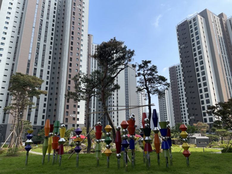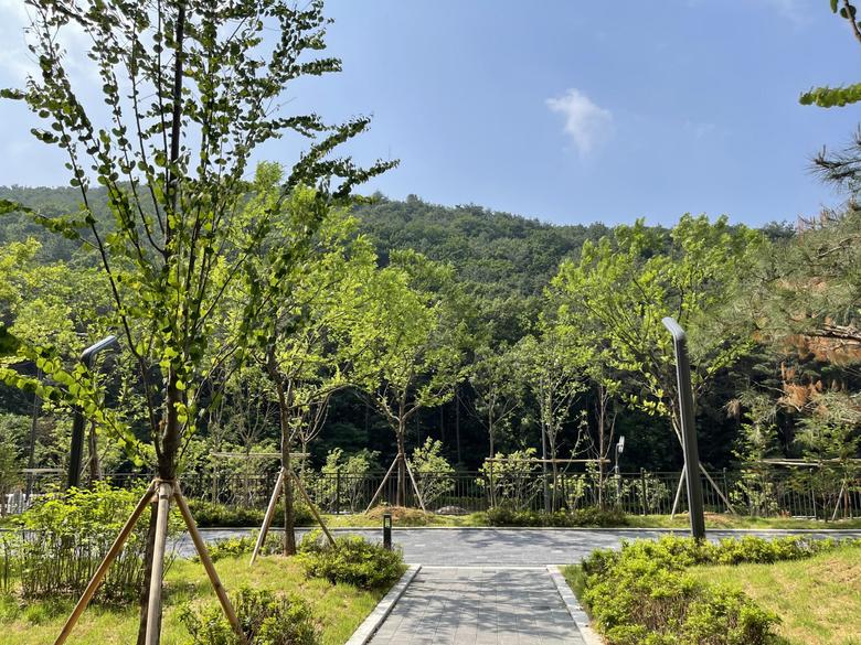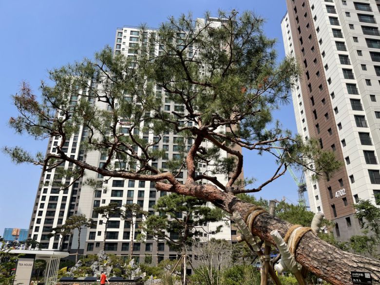'진경산수원'은 전통 회화 속 산수경관을 모티브로 조성된 테마정원이다. 곳곳에 배치된 소나무는 강한 생명력을 상징하며, 수형을 살려 정성스럽게 관리된 모습은 단지의 조경 완성도를 높인다. 나무 사이로 보이는 고층 아파트와 어우러진 풍경은, 도심과 자연의 조화라는 테마를 직관적으로 보여준다.