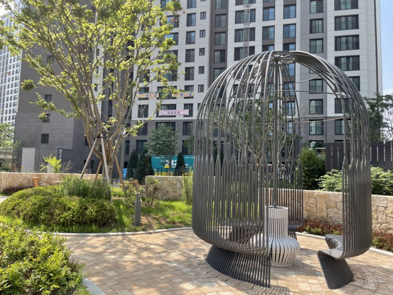 새장 형태의 조형 벤치는 단순한 휴게 공간을 넘어 이색적인 포토존 역할까지 겸한다. 철제 프레임 사이로 비치는 햇살과 주변 녹음이 어우러져, 마치 하나의 조형물 안에 들어와 있는 듯한 아늑함을 제공한다.