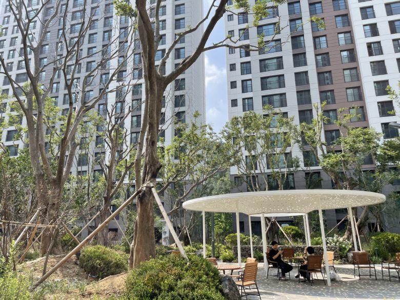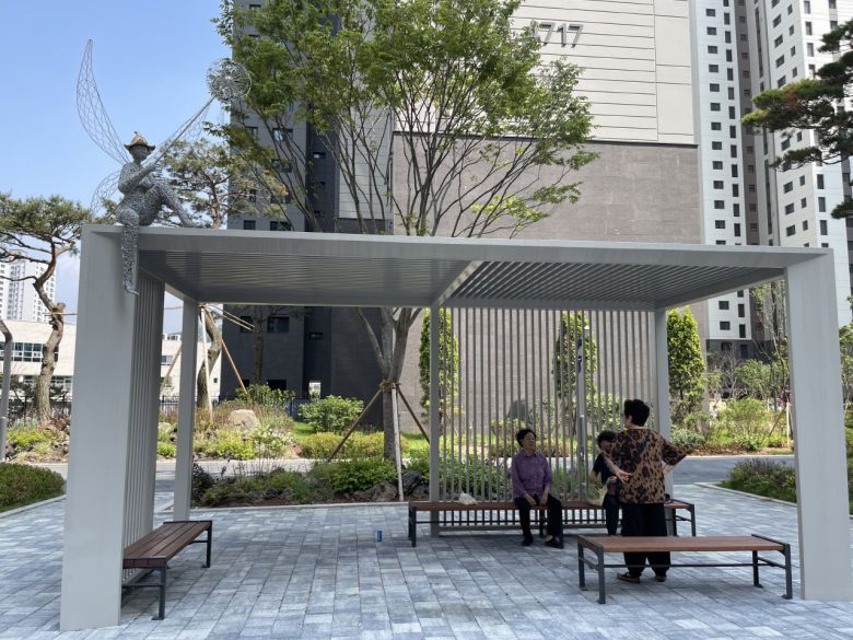 붉은색 파라솔 아래 놓인 벤치와 주변의 다양한 수목 식재는 뜨거운 햇살 아래에서도 머무를 수 있는 휴식처를 마련한다. 그늘 아래 삼삼오오 모인 입주민들의 모습은 단지에 자연스러운 생기를 불어 넣는다.
