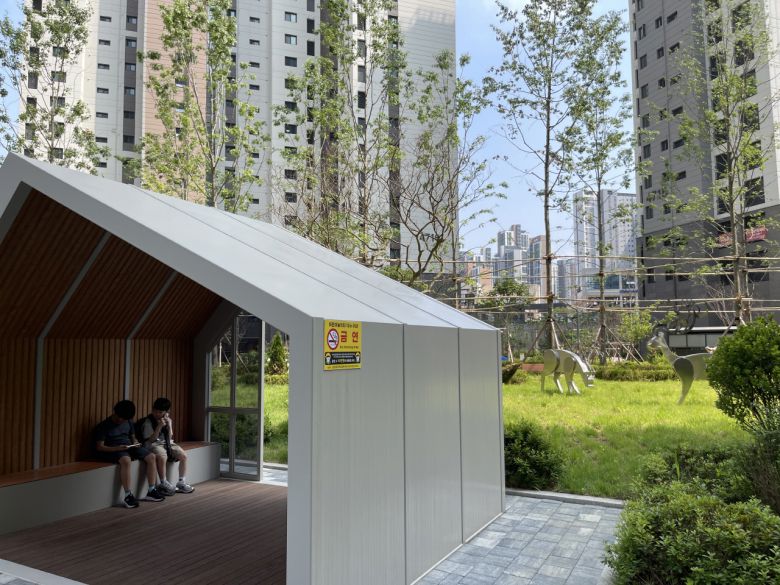 여유롭게 배치된 테이블은 주민들이 담소를 나누거나 책을 읽으며 시간을 보낼 수 있는 편안한 쉼터가 된다. 특히 원형 캐노피 아래 마련된 휴식 공간은 햇볕을 적절히 차단해 주며 사계절 활용도를 높인다.
