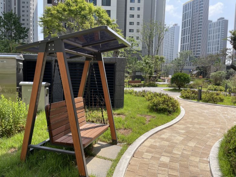 그네 벤치는 천천히 흔들리는 움직임 속에서 입주민들이 자연과 교감할 수 있는 작은 쉼표가 된다. 곳곳에 놓인 벤치와 적절히 배치된 조경 요소들은 정원의 완성도를 높이며, 걷고 머무는 경험 모두에 감성을 더한다.