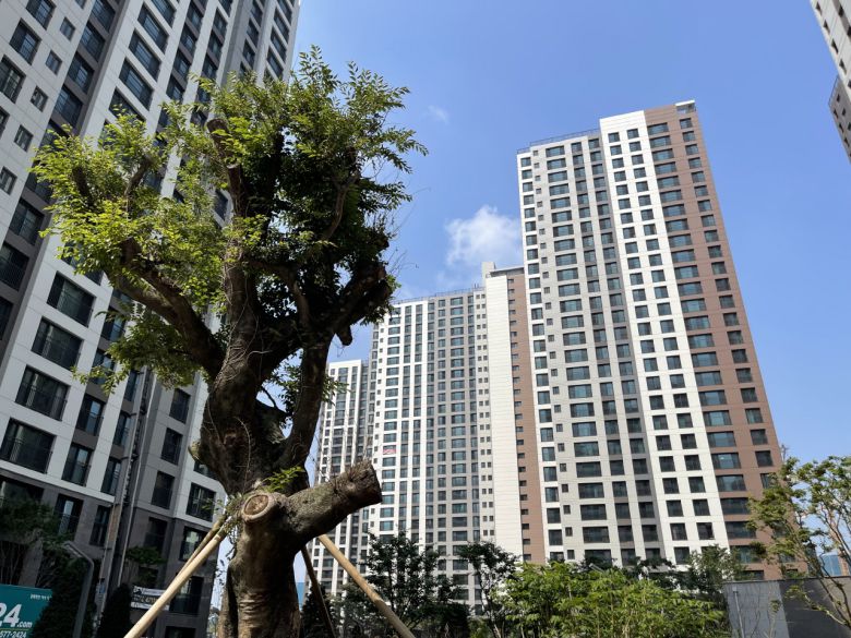 수직으로 뻗은 외관과 단정한 창호 라인이 어우러지며 깔끔한 스카이라인을 완성한다. 단지 내부 곳곳에 배치된 조경수와 녹지는 콘크리트 위에 적당한 여백과 생기를 더한다.
