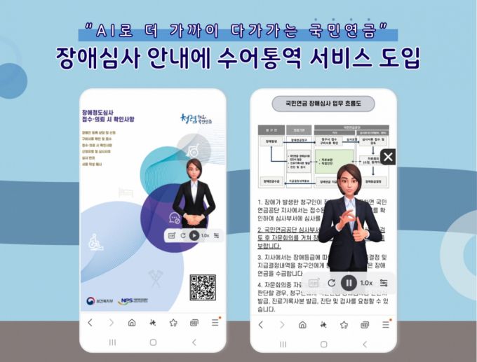 국민연금공단은 19일부터 국민연금법에 따른 장애심사와 장애인복지법에 따른 장애정도심사의 제도, 신청 절차 등 안내에 인공지능 기술을 이용한 수어통역 서비스를 제공한다.