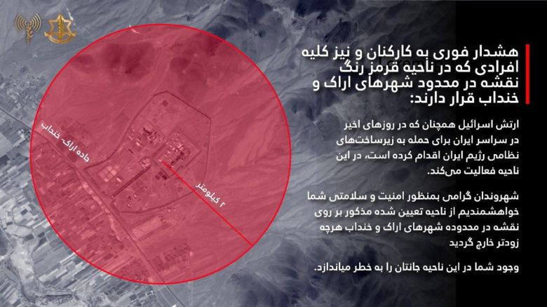 이스라엘은 공격 전 아라크 지역 주민들에게 대피를 경고했다. 이스라엘군은 자국 공식 텔레그램 채널과 소셜미디어 X(엑스·옛 트위터) 페르시아어 계정을 통해 “주민과 노동자, 체류자는 즉시 대피하라. 머무를 경우 생명에 위험이 있다”고 밝혔다. 이스라엘은 해당 지역 위성사진에 붉은색 경고 원까지 표시하며 공습을 예고했다.