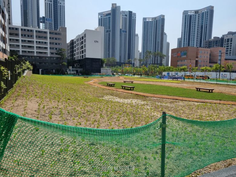 [헤럴드경제=박로명 기자] 지난 18일 서울 강남구 개포동 일대. 2023년 6702가구 규모 ‘디에이치퍼스티어아이파크’가 입주한 이곳엔 아직 개발 계획이 정해지지 않은 기부채납 부지가 공터로 남아 있었다. 한때 아이스링크장, 실내테니스장 건립 등을 검토했던 부지였지만, 현재 공기정화 식물인 ‘양삼’을 심은 ‘양삼공원’으로 활용되고 있었다.