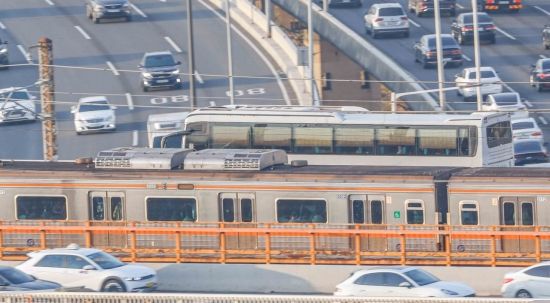 지난 1월2일 서울 성동구 동호대교 위를 달리는 지하철에 시민들이 몸을 싣고 출근길에 오르고 있다. 강진형 기자 |