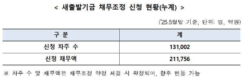 한국자산관리공사(캠코)와 신용회복위원회는 지난 5월 말 기준 '새출발기금' 의 누적 채무조정 신청자 수는 13만1002명, 누적 신청 채무액은 21조1756억원 규모로 집계됐다고 19일 밝혔다.