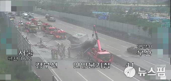 [울산=뉴스핌] 오영균 기자 = 19일 오후 2시 27분쯤 울산시 울주군 언양읍 경부고속도로 서울 방향 언양분기점 인근에서 25t 트레일러 2대가 추돌하는 사고가 났다. [사진=송영훈 독자 제공] 2025.06.19 gyun507@newspim.com |