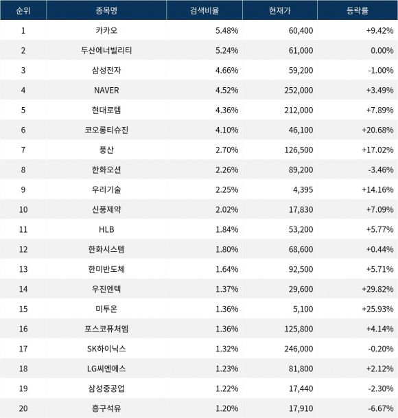 이어 검색비율 2위의 두산에너빌리티(034020)는 보합세로 마감했다. 검색비율 3위의 삼성전자(005930)는 -1.00%로 약보합세로 거래를 마쳤다. 검색비율 4위 NAVER(035420)는 3.49% 상승 마감했다. 검색비율 5위 현대로템(064350)은 7.89%의 상승률을 기록했다.