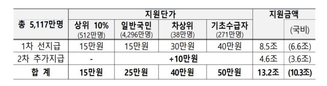 1차로 전 국민에게 1인당 15만원(차상위 30만원, 기초 40만원)을 우선 지급함으로써 단기간에 총 8.5조원 규모 소비 여력 보강하겠다고 설명했다. 농어촌 인구소멸지역(84개 시·군, 411만명)은 1인당 2만원을 추가 지원한다.