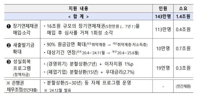 먼저, 소상공인 재기 지원에 1.4조원을 편성하고, 고금리 기간 누적된 채무상환 부담을 경감하기위해 취약차주 143만명 대상으로 특별 채무조정 패키지를 마련하겠다고 밝혔다.