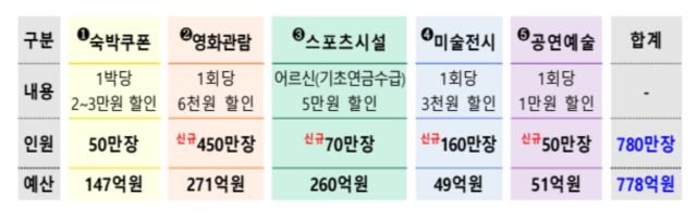 한편 고효율 가전제품 구매비용의 10%(30만원 한도)를 환급해 내수경제 활성화 및 전력 소비 저감 유도하고 숙박, 영화 관람, 스포츠시설 등 5대 분야 소비진작을 위한 할인쿠폰 780만장을 제공하기로 했다.
