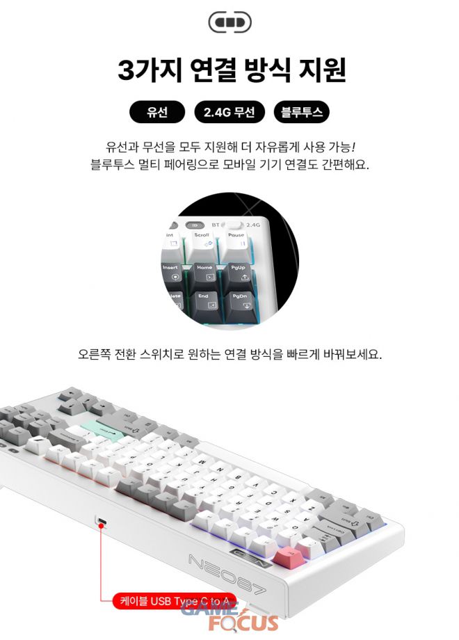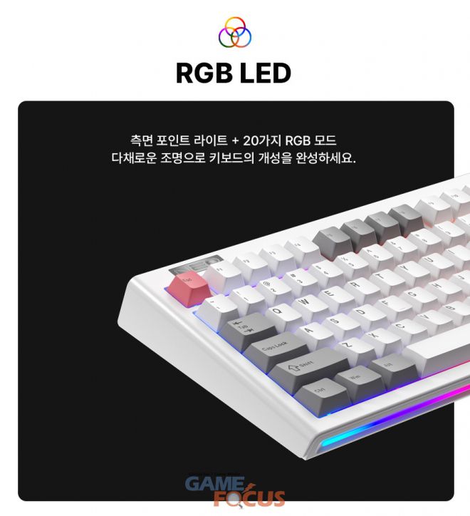 외형 또한 RGB LED와 함께 키보드 전면 하단, 가로로 긴 포인트 RGB LED 조명을 더해 튜닝 효과까지 끌어올렸다. 총 20가지의 RGB 모드를 지원하며, NEO87 전용 소프트웨어를 통해 취향에 맞게 설정이 가능하다. 최대 1,000MHz의 폴링 레이트를 지원, 빠른 응답속도를 가지며, 무한 동시 입력으로 게이밍 또는 사무 작업에서도 최상의 퍼포먼스를 경험할 수 있다.