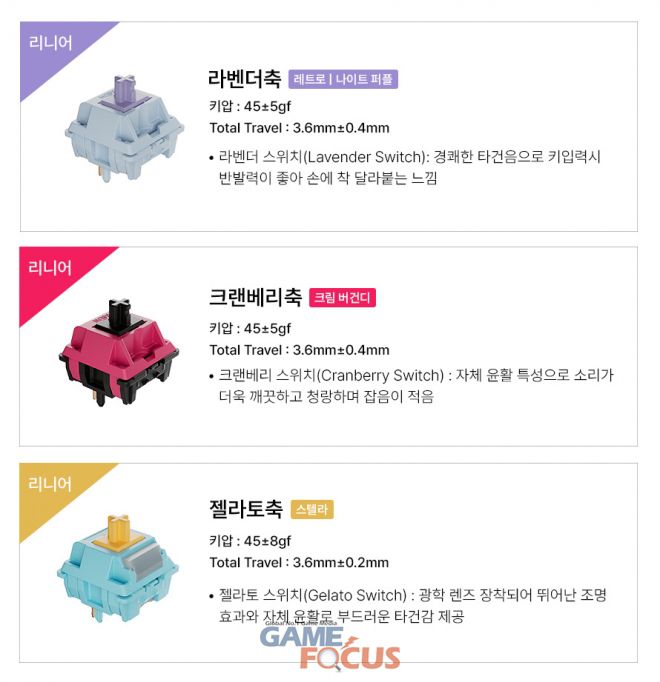 5중 흡읍재 및 가스켓 설계를 더하여, 소음 및 충격을 최소화, 통울림을 방지하였으며, 핫스왑 소켓으로 언제든지 손쉽게 스위치를 교체할 수 있어 사용자가 원하는 키감으로 커스터마이징을 할 수 있다 여기에 인체공학적 스텝스컬쳐2 설계를 더하여, 타이핑 시 손목과 손가락에 부담을 감소시켰으며, 높이 조절 받침대를 통해 최소 경사각 4도에서 최대 9도까지 2단계 조절이 가능하다.