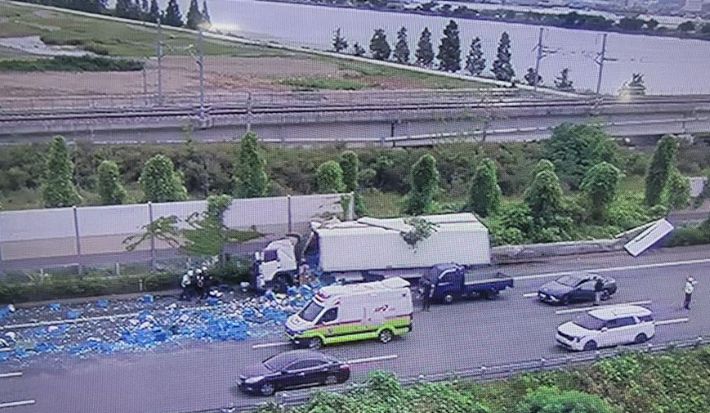 경찰은 4개 차로 가운데 2개 차로를 통제하고 낙하물 수거 등 조치에 나서는 한편, 정확한 사고 경위를 조사하고 있다.