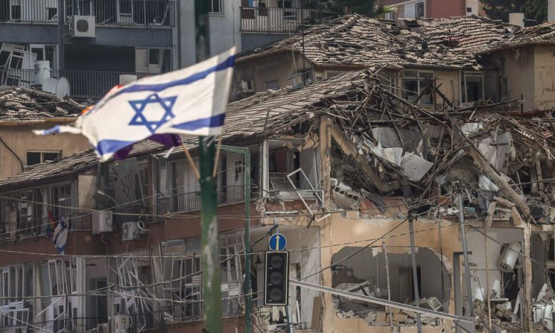 18일(현지시각) 이란 미사일의 공격을 받은 이스라엘 텔아비브 인근 파괴된 건물 앞에 이스라엘 국기가 펄럭이고 있다. AFP 연합뉴스 |