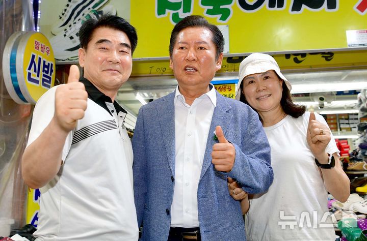 [광주=뉴시스]이현행 기자 = 더불어민주당 당 대표 출사표를 던진 정청래 의원이 19일 오후 광주 북구 우산동 말바우시장을 방문해 시장 상인들과 기념촬영을 하고 있다. 2025.06.19. lhh@newsis.com