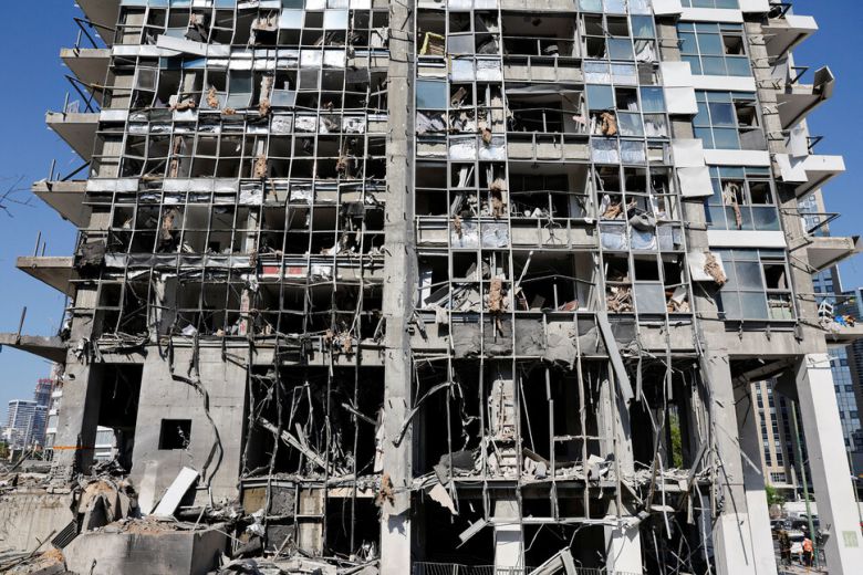 19일(현지시각) 이스라엘 라마트간에서 이란의 미사일 공격 이후 손상된 건물 모습. 라마트간/로이터 연합뉴스 |