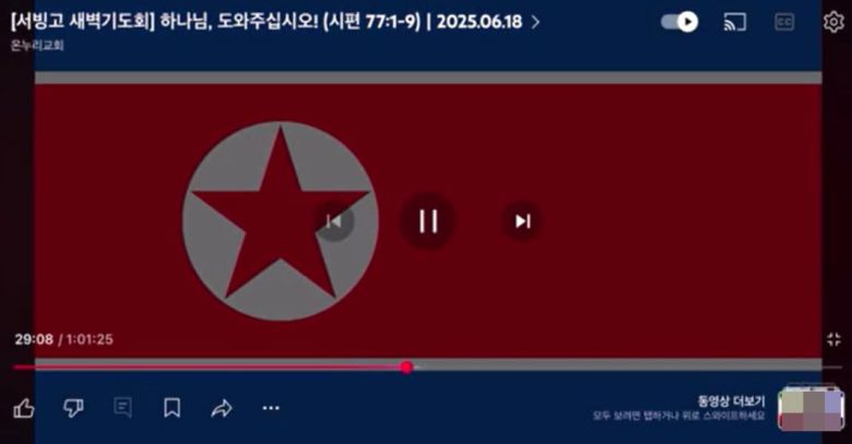 국내 대형 교회 가운데 하나인 온누리교회가 유튜브로 생중계하는 새벽 예배 방송에서 북한 인공기가 20초가량 송출되는 일이 벌어졌다. 교회 측은 사고 원인을 조사 중인 한편, 외부 해커 소행일 가능성을 의심하고 있다.