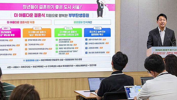 [오세훈/서울시장 : 예식 지원은 물론이고 결혼 장려금에 해당하는 비품비 100만 원도 지원하고 있습니다. 아름다운 장소 제공과 합리적인 비용과 매끄러운 진행 등으로 이용자 만족도 또한 97%에 이릅니다.]
