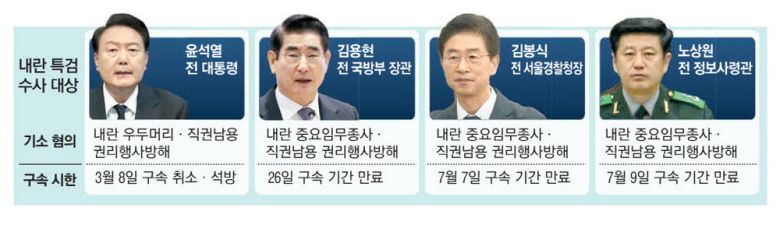 다른 내란 혐의 피고인들의 구속 기간도 조만간 줄줄이 끝난다. 오는 30일 여인형 전 방첩사령관과 이진우 전 수도방위사령관, 다음달 7일 김봉식 전 서울경찰청장, 같은 달 9일 노 전 사령관 등의 구속이 만료된다. 계엄 핵심 인물들이 잇따라 풀려나면 특검 수사가 차질을 빚을 수 있는 만큼 조 특검이 이들에게도 추가 혐의 기소를 통해 구속 상태를 유지하는 방안을 모색할 가능성이 크다는 관측이 나온다.