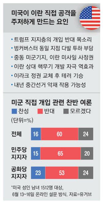 여론도 부정적이다. 이날 영국 일간 가디언에 따르면 지난 13∼16일 18세 이상 미국 시민 1512명을 상대로 조사한 결과 '이스라엘과 이란의 충돌에 미군이 개입해야 하느냐'는 질문에 응답자 60%가 반대했다.