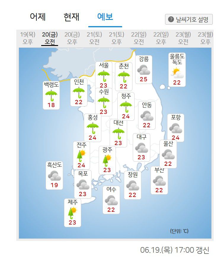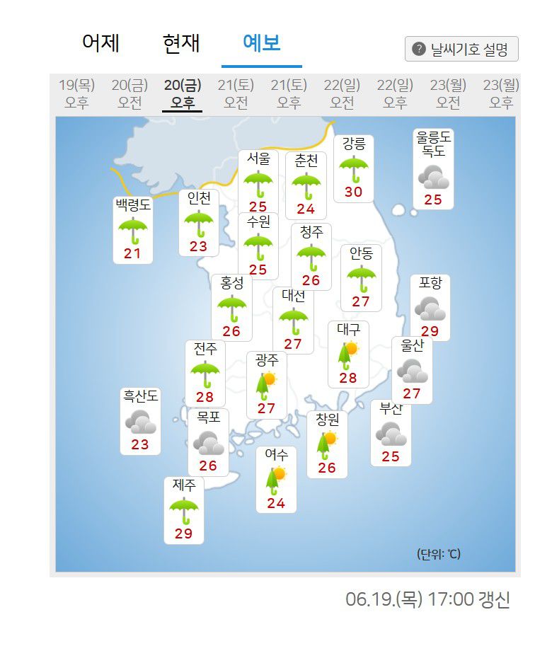 비가 내리면서 낮 기온이 오늘(19일, 25~36도)보다 2~5도가량 낮아지겠고, 전국 대부분 지역에서 26도 내외로, 평년(최저 17~20도, 최고 23~29도)보다 조금 낮아지겠으나, 비가 그친 뒤에는 다시 낮 기온이 올라 덥겠다.