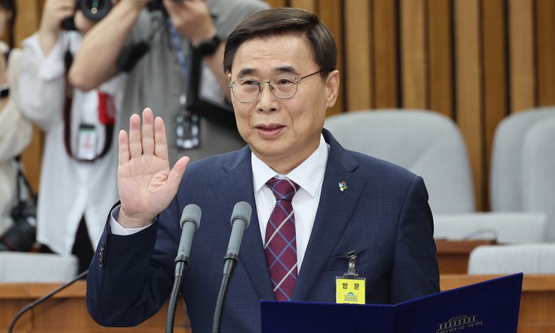 선서 이종석 국가정보원장 후보자가 19일 서울 여의도 국회에서 열린 인사청문회에서 선서하고 있다. 이날 청문회는 이재명정부 출범 이후 처음으로 실시된 인사청문회로 후보자의 대북관 등을 두고 열띤 공방이 벌어졌다. 허정호 선임기자 |