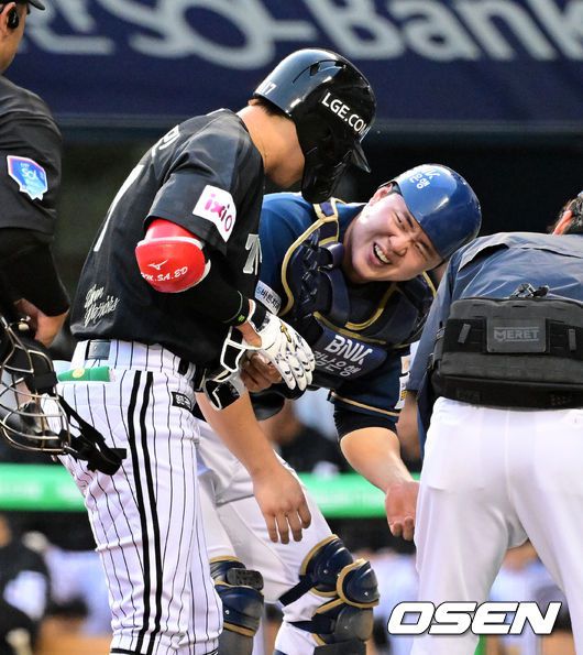 [사진]박해민-김형준, '아프냐, 나도 아프다'