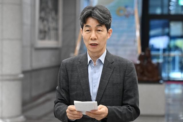 윤건영 더불어민주당 의원이 5월 12일 경기 과천시 중앙선거관리위원회를 찾아 비상계엄 선포 당시 계엄군 진입 관련 현장 방문을 마친 뒤 브리핑을 하고 있다. 박시몬 기자 |