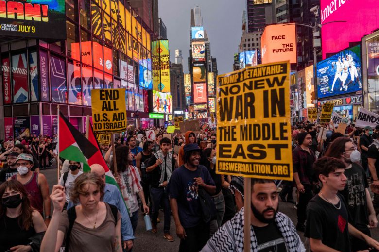“중동 전쟁은 그만” 18일(현지시간) 미국 뉴욕에서 시민들이 도널드 트럼프 대통령에게 이란과 전쟁을 시작하지 말라고 요구하며 행진을 하고 있다. AFP연합뉴스 |