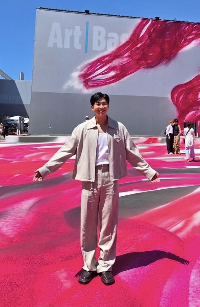 공개된 사진은 RM이 한 가전 브랜드의 홍보대사로 스위스 바젤에서 열린 세계 최대 아트 페어 ‘아트 바젤 인 바젤 2025’에서 해당 브랜드의 부스를 둘러보는 모습을 담고 있다.