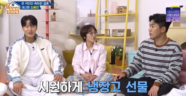 김종국은 결혼 선물도 크게 했다고. 김종민은 "깜짝 놀랐다. 잘 안 쓰는 것으로 알고 있었는데, 냉장고를 개인 카드로 선물해 줬다. 300만 원"이라고 고마워했다.