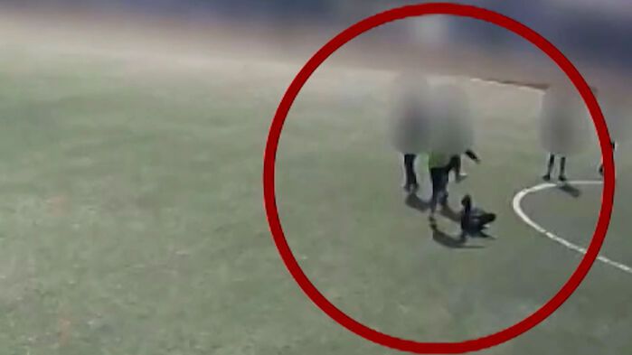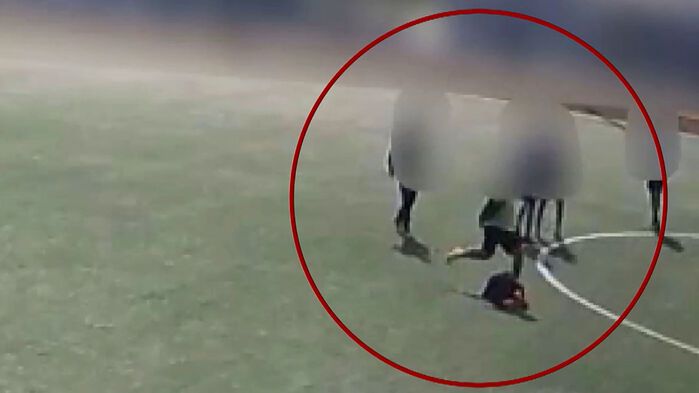 쓰러져 있는 A 군 곁으로 축구를 하는 동급생들이 뛰어다니는 아찔한 상황이 이어졌고, A 군은 폭행을 당한 지 18분이 지나서야 구급차에 올랐습니다.