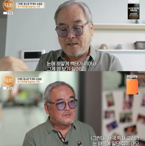 나이가 들수록 백태가 심해졌다고. 순동운은 "사극이 참 재밌다. 하지만 사극을 찍자고 하면 일단 겁이 난다. 하고 싶어도 방법이 없으니까. 나 자신이 남들에게 피해를 주면 안 되지 않냐"고 연기 활동을 멈춘 이유를 밝혔다.