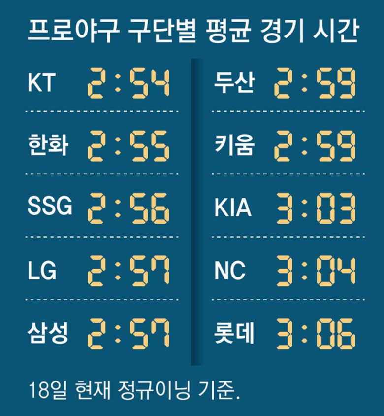 구단별로는 KT가 2시간 54분, 한화가 2시간 55분으로 경기 시간이 짧다. KT는 팀 평균자책점 3위(3.59), 한화는 1위(3.41)다. 평균 경기 시간이 가장 긴 롯데(3시간 6분)는 팀 평균자책점도 4.81로 9위에 처져 있다.