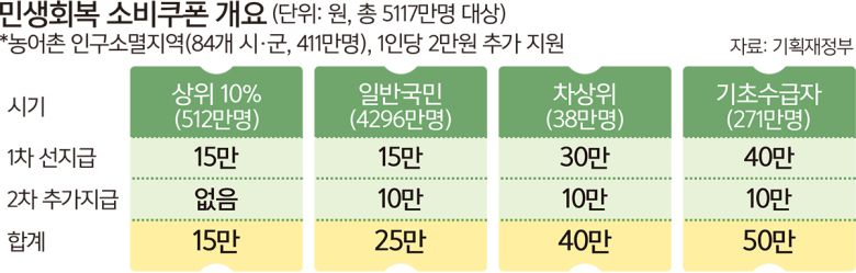정부는 13조2000억원(국비+지방비)을 투입해 전 국민(5117만명)에게 1인당 15만~50만원을 소득별로 지급하기로 했다. 소비쿠폰은 두 차례에 걸쳐 단계적으로 지급된다. 우선 전 국민에게 1인당 15만원을 지급하되 차상위계층(38만명)과 기초수급자(271만명)에게는 각각 30만, 40만원이 차등 지급된다. 1차 지급분은 추경안이 국회를 통과한 뒤 약 2주 안에 지급될 예정이다. 아울러 농어촌 소멸지역인 84개 시·군에 있는 411만명에게 1인당 2만원이 추가 지원된다. 정부는 2차로 건강보험료 등을 통해 도출한 상위 10%(512만명)를 제외한 국민의 90%에게 1인당 10만원을 추가 지급할 계획이다. 소비쿠폰은 현금을 제외한 지역화폐, 선불카드, 신용·체크카드 중 한 가지 방식으로 지급되며 사행·유흥업종은 사용처에서 제외된다.